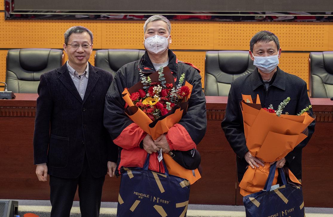 章军锋经理为2021年荣休老师送鲜花和颁发纪念品