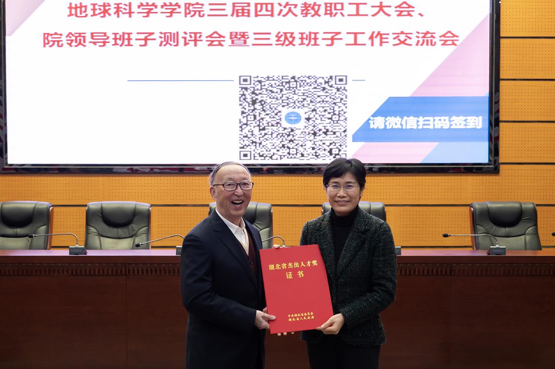 公司党委书记黄晓玫为殷鸿福院士颁发湖北省杰出人才奖证书