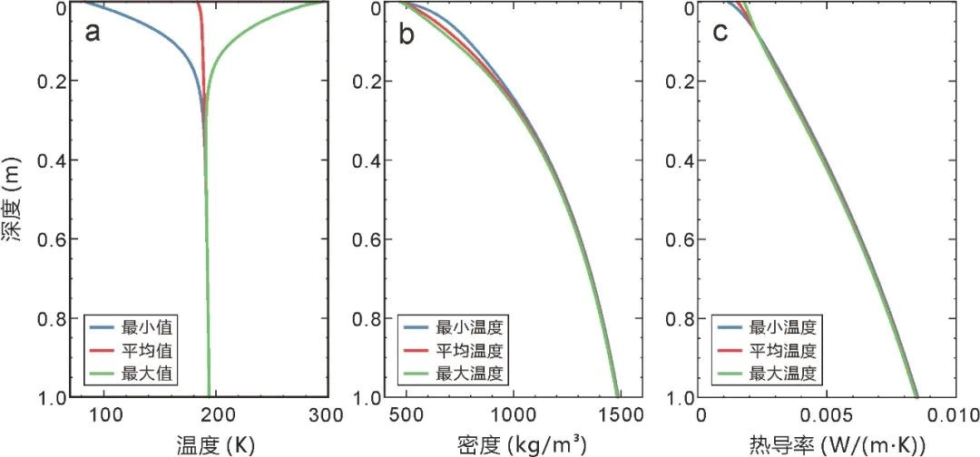 (a)从月表到1米深度的最小、平均和最大温度的剖面图。(b和c)从月表到1米深度的密度剖面图和热导率中的热传导分量剖面图,对应图4a的最小、平均和最大温度